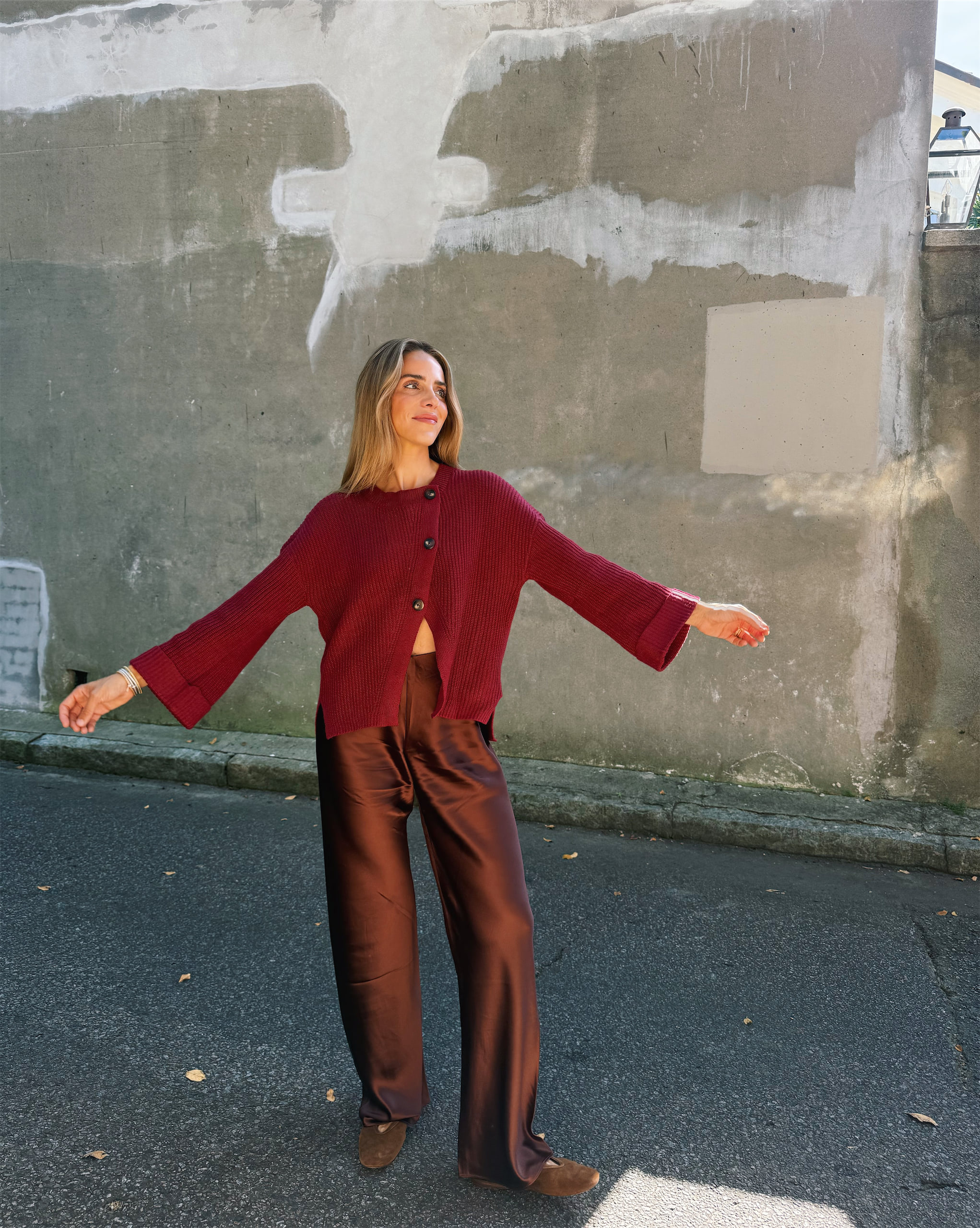 Oversized Cardigan, Pants, Ballet Flats (similar here)