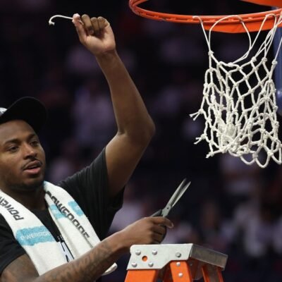 TUCSON, ARIZONA – MARCH 02: Jaden Bradley #0 of the Arizona Wildcats cuts down the nets as he celebrates winning the Big 12 regular-season title
